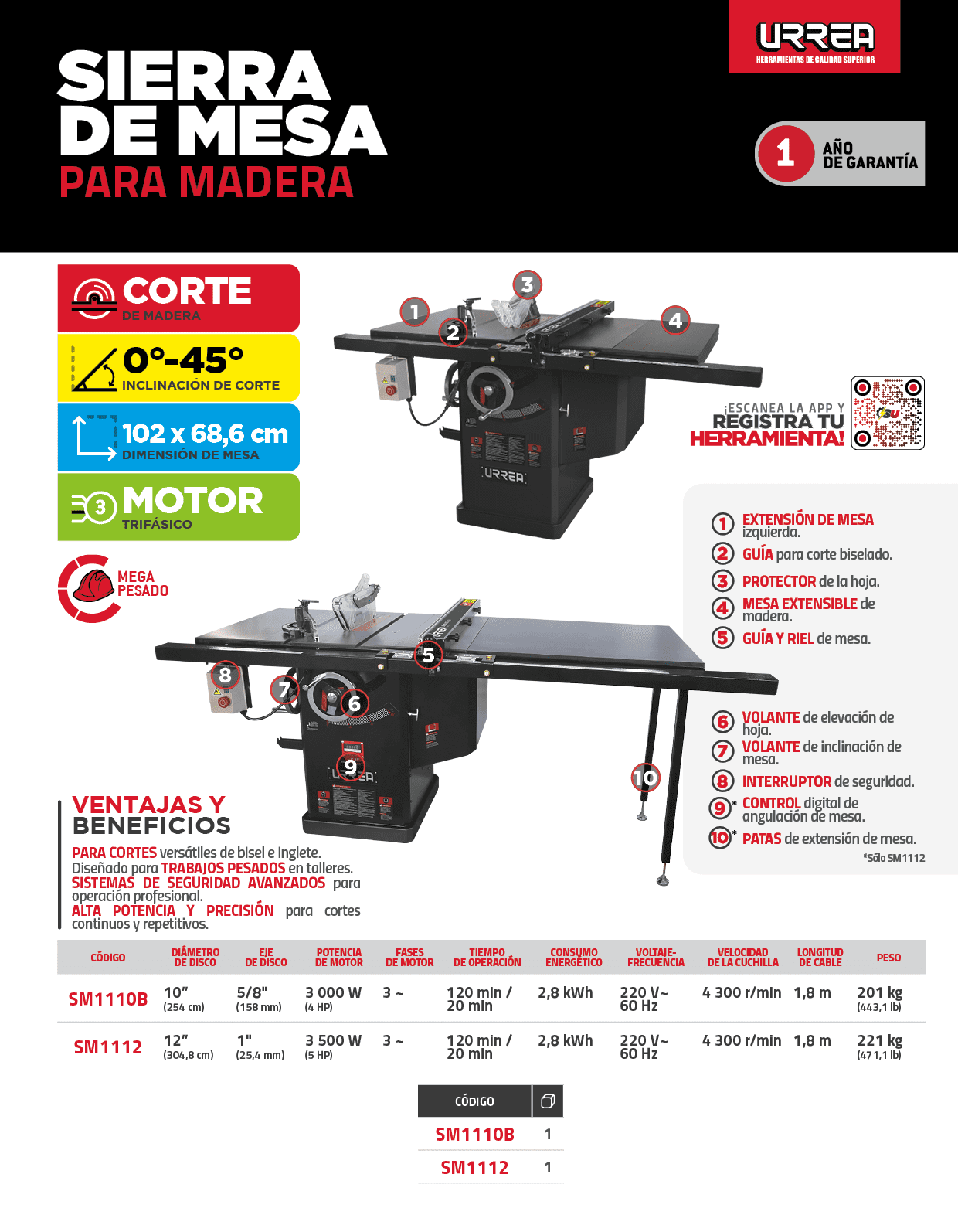Sierra de mesa con ducto de salida para polvo 10", 3 HP, 2200 W, 220 V, 3580 RPM UrreaSierra de mesa con ducto de salida para polvo 10″, 3 HP, 2200 W, 220 V, 3580 RPM Urrea