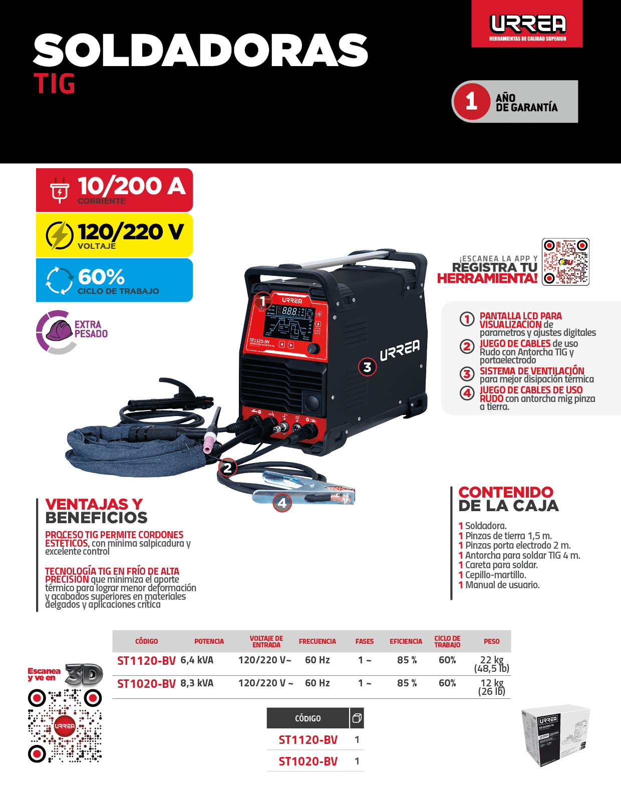 -Soldadora inverter TIG, voltaje 120/220 V 60 Hz, rango de corriente de salida TIG 120 V: 110-160 A; 220 V: 10-200 A, MMA 120 V: 30-120 A;220 V: 30-160 A, potencia 6.4 kVA.