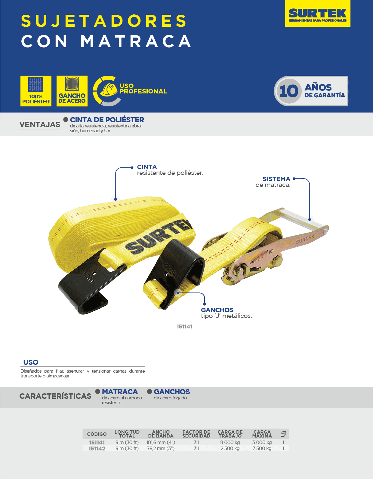 Sujetador con matraca con gancho tipo plano 3″ x 9 m, 2500 kg Surtek