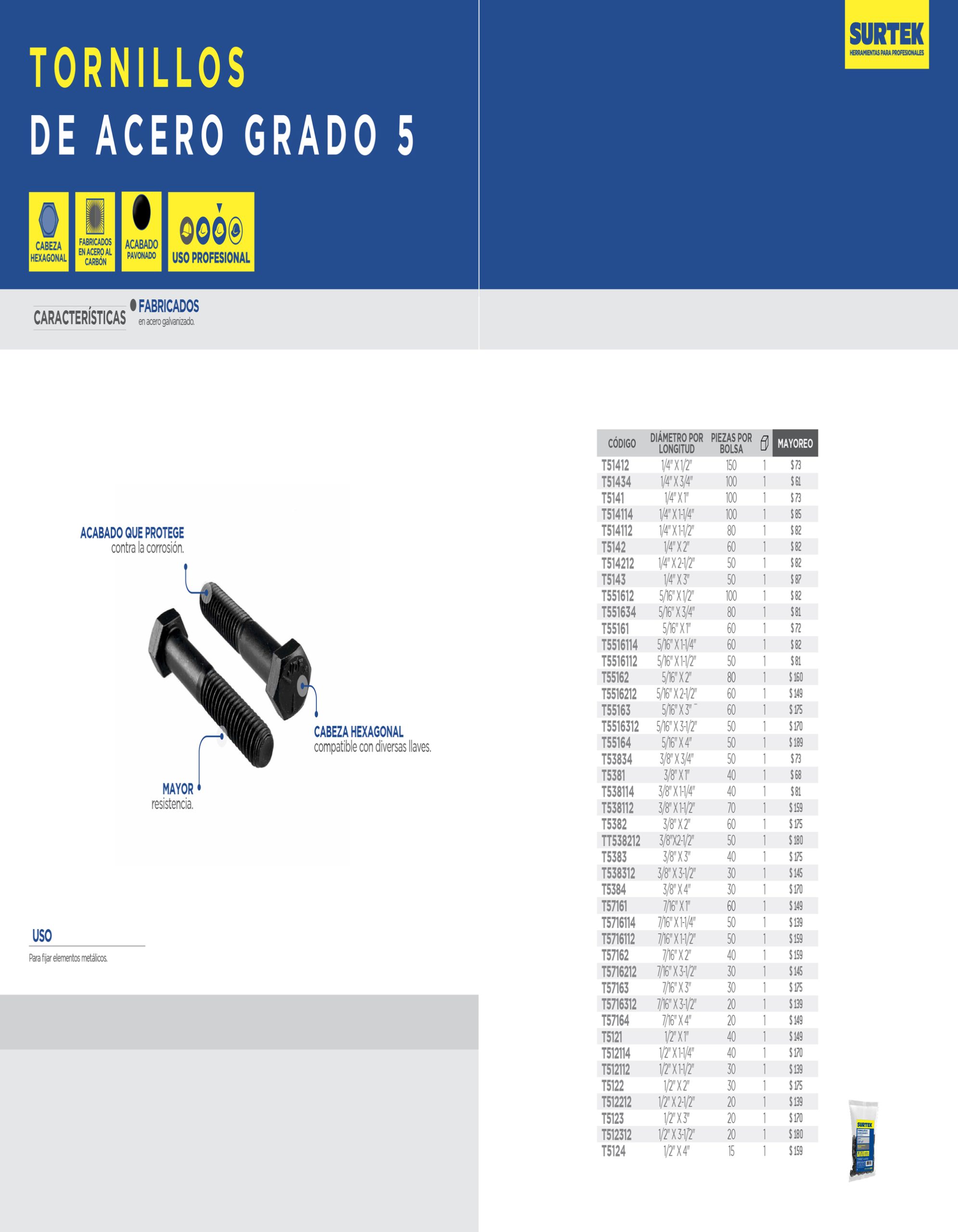 Tornillo de acero 5° rosca parcial, 1/2″ x 3-1/2″, 20 piezas Surtek