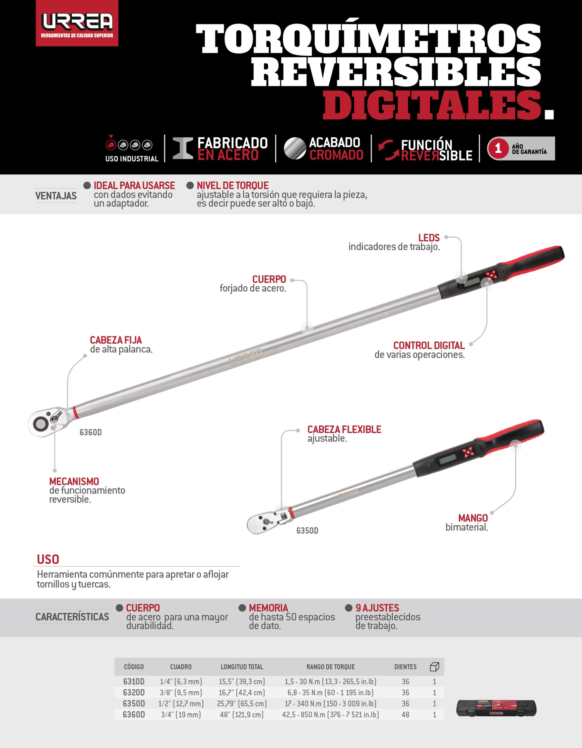 Torquímetro digital cuadro de 3/8″, 60-1200 in-lb Urrea