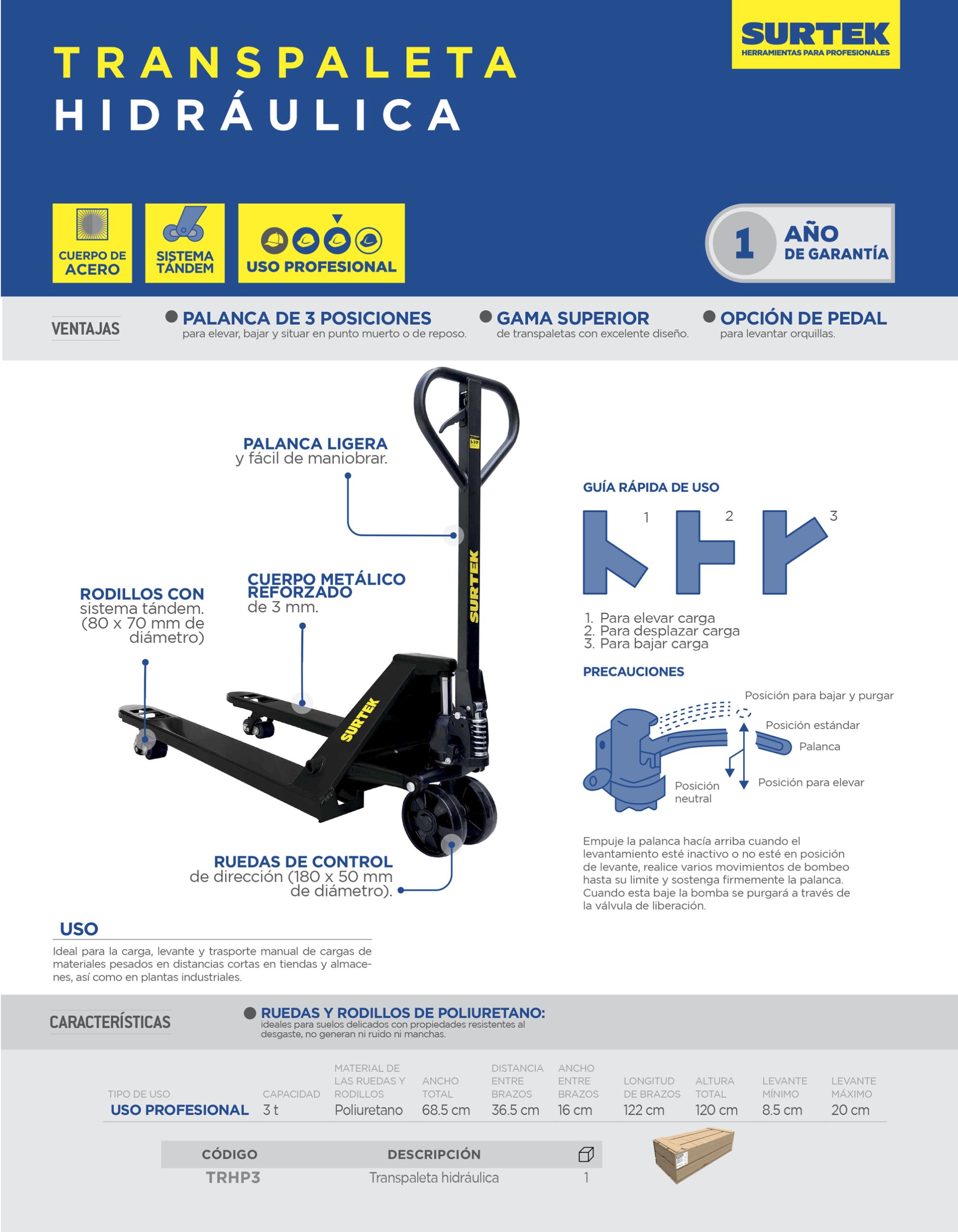 Transpaleta hidraulica con ruedas de poliuretano 3 toneladas, manual de uso.