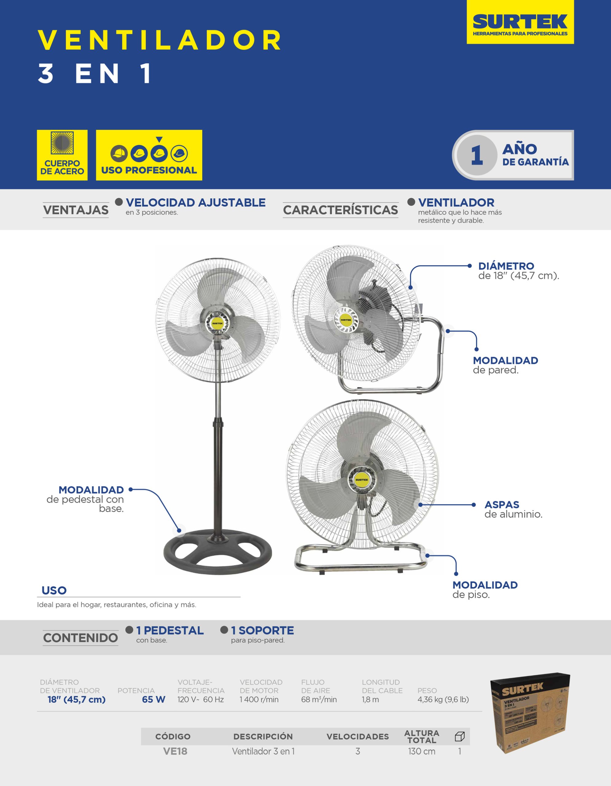 Ventilador 3 en 1, 3 velocidades, 18″ Surtek