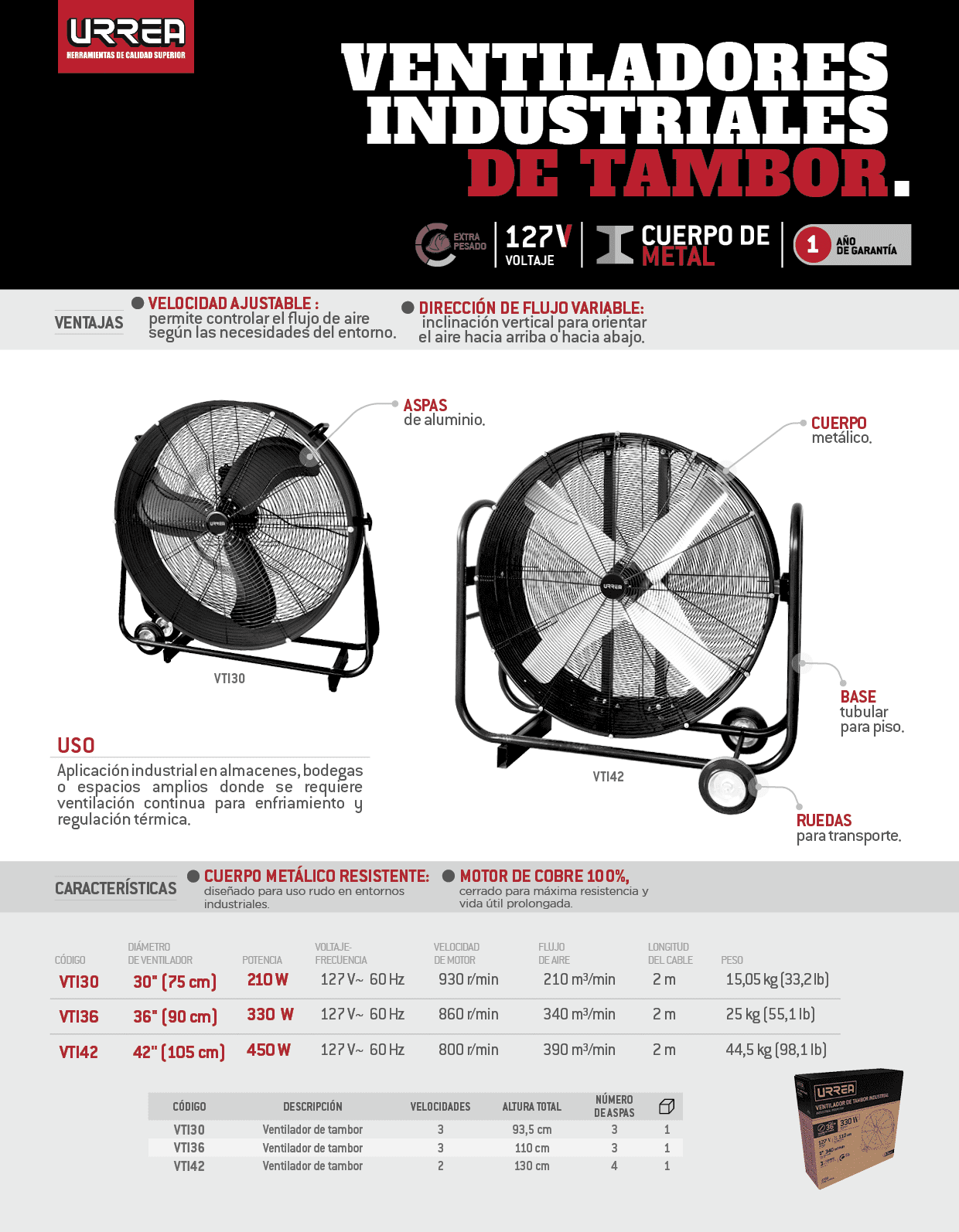 Ventilador de tambor industrial 3 velocidades, 36″ Urrea